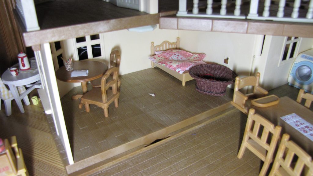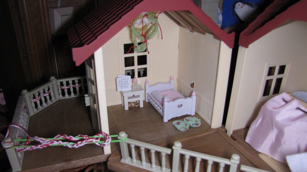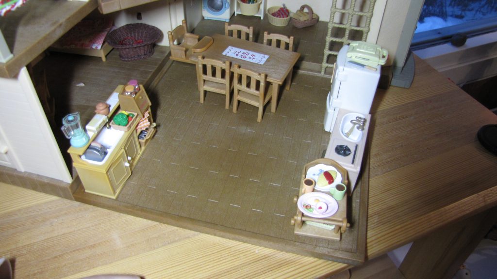 Kuvaus: kaksi huonetta (toisen huoneen lattia voi olla myös etupiha), sisältää valokiinnikkeen, mutta valo ei kuulu mukaan ja mukana tuli pöytä, sänky, keittiön hylly ja Reea Suklaapupu.