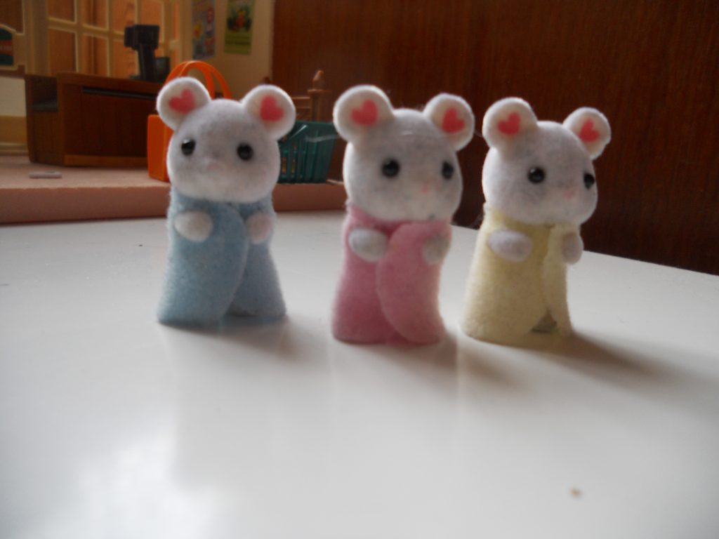 Kuvaus: Kolme söpöä vaahtokarkkihiirtä.