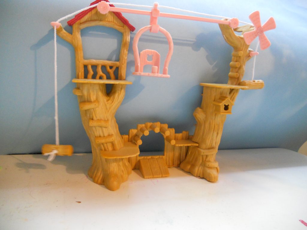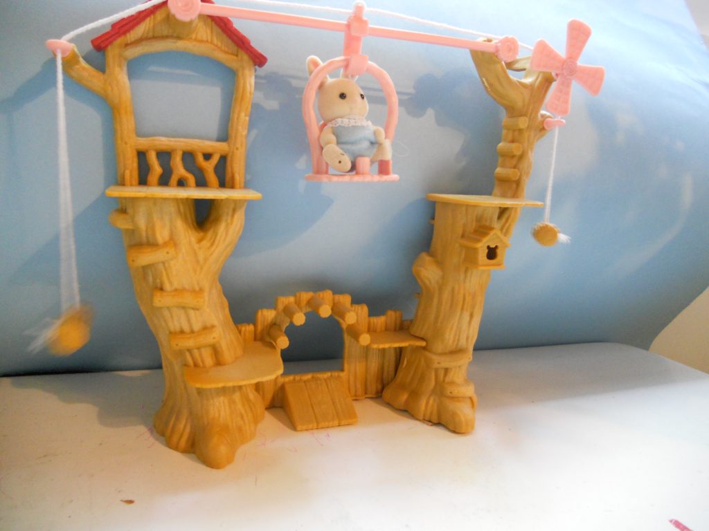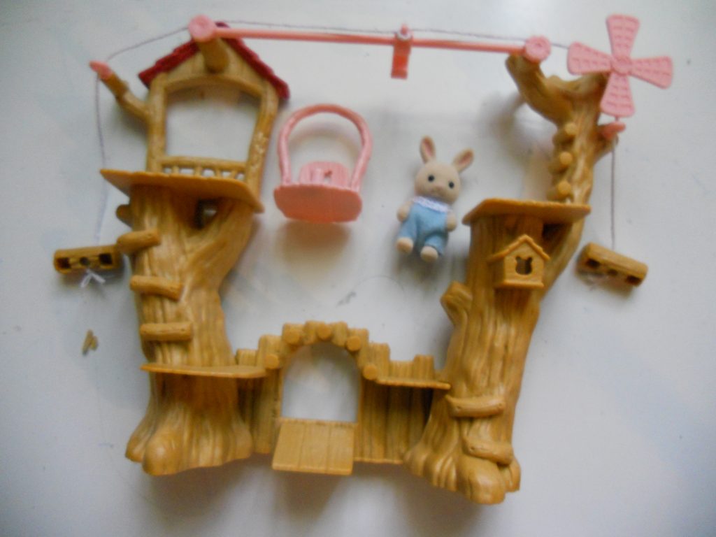 Kuvaus: Vauvojen mini puumaja köysiradalla. Taka puolella mini huoneita ja tikkaat. Etu puolella silta ja köysirata.